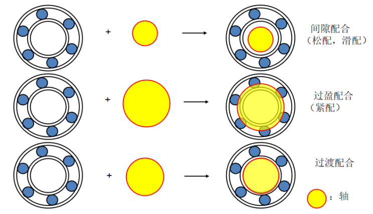配合:轴与内圈,机壳与外圈之间的装配,嵌合的松紧程度。