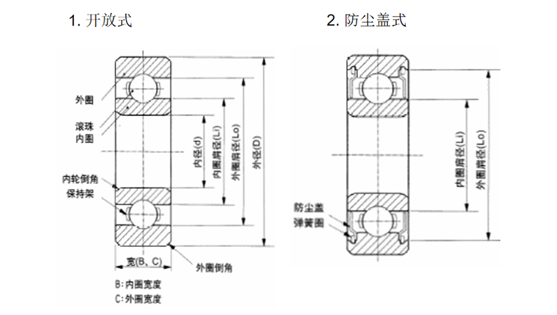 开式轴承: 以深沟球轴承为例: 轴承两面不带防尘盖